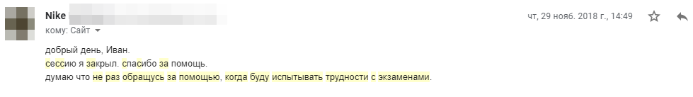 - Сессия под ключ - мы помогаем студентам подготовиться к сессии и успешно сдать все экзамены. Наши авторы могут помочь в подготовке к экзаменам, предоставляя материалы для самостоятельного изучения, а также проводить консультации по возникающим вопросам.